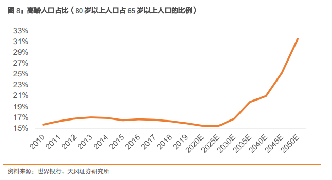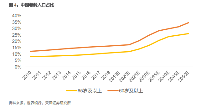 按照世界银行的估算,2019年65 岁以上人口已经达到总人口的 11.5%,相当于每10个人里面有一位老年人。但是这个比例到2035年将突破 20%,到2050年将上升至26.07%,到那时平均每四个人中间就有一位老年人。