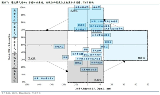 从景气时钟来看,港股景气“筑底位”、“爬坡位”进一步聚集至大消费、TMT。