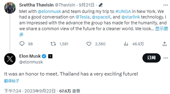 他威信在周四也曾提及,在纽约之行期间他与特斯拉CEO马斯克进行了对话。泰国政府在声明中表示,他威信告知马斯克泰国政府准备在现有的电动车产业激励框架下支持特斯拉的投资,而马斯克“称赞了泰国适宜投资的人力资源”。 对此,马斯克也公开回复称,很荣幸与他威信会面,泰国有非常令人兴奋的未来。