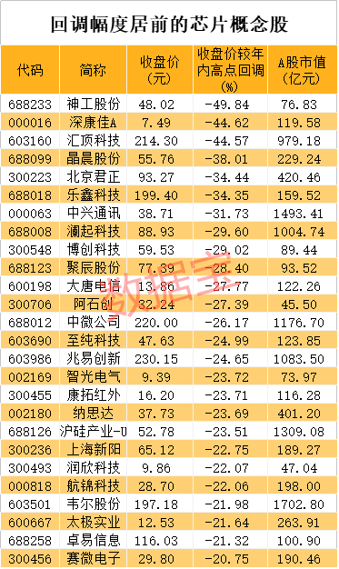 不过近期多数芯片概念股都处于调整态势,数据宝统计显示,与年内高点相比,有26只芯片概念股回调幅度超过20%。神工股份、深康佳A、汇顶科技、晶晨股份、北京君正等回调幅度排在前五位,其中神工股份回调幅度49.84%居首,该公司是国内领先的集成电路刻蚀用单晶硅材料供应商,上市首日便冲高回落,之后震荡调整至今。身兼华为概念、无线耳机、芯片、人工智能等多重题材的汇顶科技已回调44.57%,最新A股市值已不足千亿元。