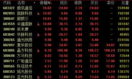 5G概念股10日盘中再度拉升上扬,截至发稿,超讯通信、国脉科技、超频三、中通国脉、依米康、华脉科技、通光线缆等涨停,意华股份逼近涨停。
