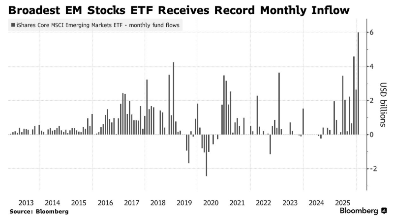 最新统计数据显示,市值规模高达1350亿美元的iShares Core MSCI新兴市场ETF(投资于全球范围的新兴市场股票,主要权重集中于中国与韩国股市)在1月吸引了近60亿美元的庞大资金净流入,有望创下自2012年该ETF基金成立以来的单月最大规模资金净流入。