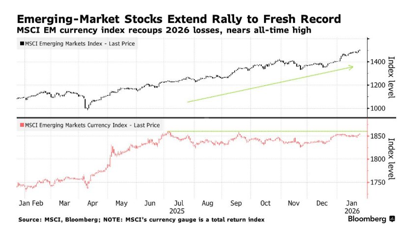 以亚洲新兴股市为核心的全球新兴市场股票,以及新兴市场主权货币、黄金与白银等国际贵金属资产延续了2025年末以及2026年开年以来的无比强劲涨势。随着美国与包括欧洲传统盟友在内的多国主权政府之间的日益紧张关系对美元资产造成重大抛售压力,新一波“抛售美国”浪潮,可谓彻底激活全球范围内的多元化资金流动并且重新点燃全球多元资产配置趋势。