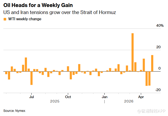 周四,WTI原油价格上涨至每桶约97美元,布伦特原油盘中一度突破107美元/桶,收盘站稳105美元关口,本周累计涨幅约16%。据两名了解情况的美国官员称,特朗普在Truth Social平台上的发文,以及他决定继续对伊朗港口实施海上封锁的举措,都对通过巴基斯坦等调解方进行的谈判造成了不利影响。