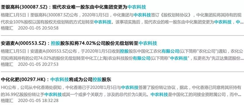 1月6日,中化集团、中国化工集团将其下属农业板块资产(化肥、农药、种子)注入一家刚刚成立半年的公司——中农科技,涉及A股安道麦A、荃银高科、扬农化工,以及H股中化化肥等多家上市公司的股权结构变动。这些上市公司中,荃银高科今日开盘即封住涨停。