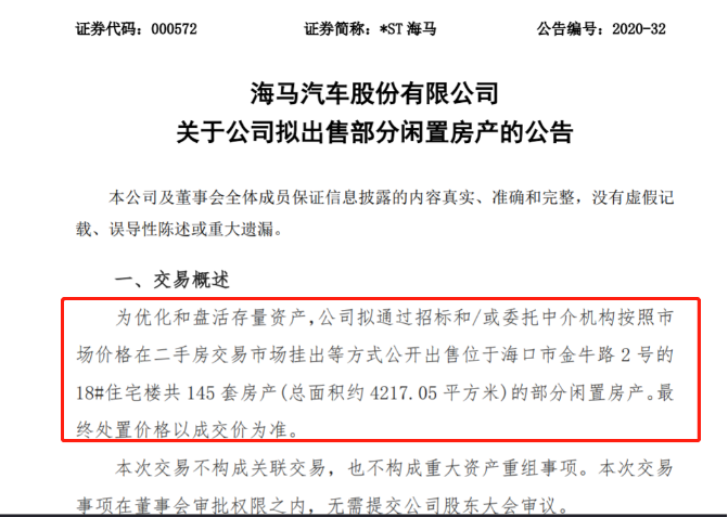 去年5月,*ST海马公告称,为优化和盘活存量资产,公司拟通过招标和/或委托中介机构按照市场价格在二手房交易市场挂出等方式公开出售位于海口市金盘工业开发区创业新村一区、二区及金盘工业区金盘大道旁的部分闲置房产。