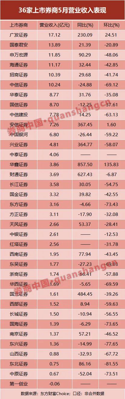 值得注意的是,6月3日才正式登陆资本市场的中泰证券,也披露了5月份业绩。数据显示,中泰证券5月份实现营业收入4.06亿元。另外,次新上市券商中银证券和红塔证券营收规模接近,分别为2.61亿、2.56亿。