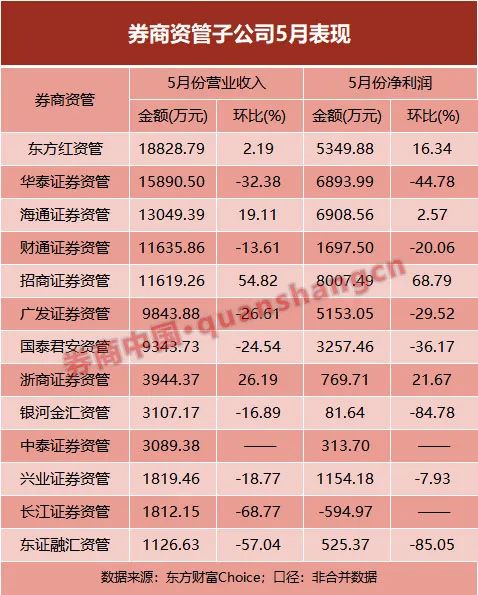 从变动来看,招商资管5月营收环比增长最高,营收环比增长55%,净利润环比上升69%。