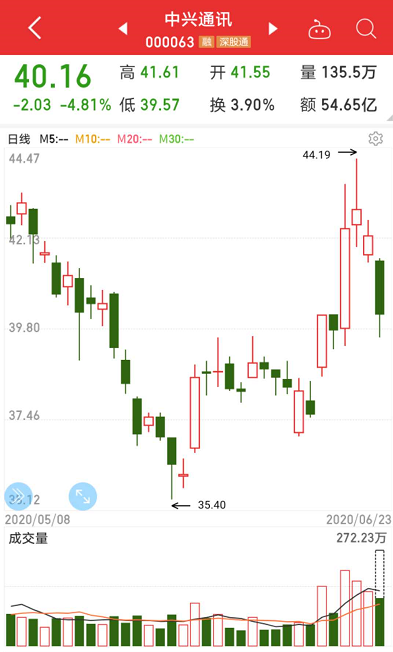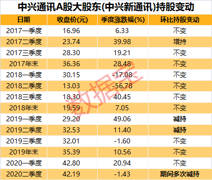 2019年一季度、二季度中兴新通讯均进行过减持,以去年二季末为起点来看,2019年6月末股价32.53元,而2018年末股价不到20元。今年二季度以来,中兴新通讯通过大宗交易方式进行多次减持,而6月22日,中兴通讯股价已上升至42元以上。减持后的6月23日早盘,中兴通讯A股价格下降至40元左右。从减持时间点来看,中兴新通讯减持均在股价高位。