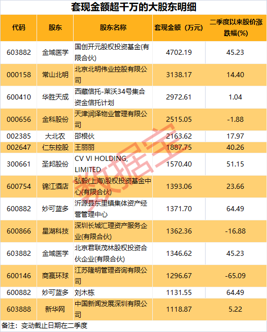 位居次位的是常山北明大股东北京北明伟业控股有限公司,套现金额超3000万元,公司股价二季度以来上涨14.4%,公司涉及网络安全、国产软件、华为等热门概念。华胜天成、金科股份大股东套现金额均超过2500万元,这两家公司二季度以来股价表现一般。另外,大北农、仁东控股及圣邦股份大股东套现金额均超过1500万元。