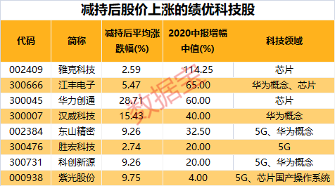 以2020年中报净利润增幅中值来看,芯片股雅克科技减持截止日至6月22日股价上涨2.59%(多笔减持以平均涨跌幅计算),其上半年净利润增幅中值有望超过100%,4月初至减持截止日股价大幅上涨近56%;其次是华为、芯片概念股江丰电子,减持截止至6月22日股价上涨5.47%,中报净利润增幅中值65%;芯片股华力创通中报净利润增幅中值60%,减持截止日至6月22日股价涨幅超过25%。