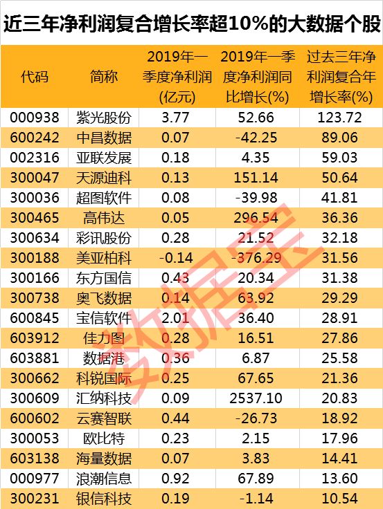 从业绩来看,近来年在国家政策扶持下,大数据产业发展迅猛,业绩方面可圈可点。数据宝统计显示,以上38只大数据概念股中,25股过去三年(截至2018年)的净利润复合增长率为正,20股更是超过10%,占比过半。