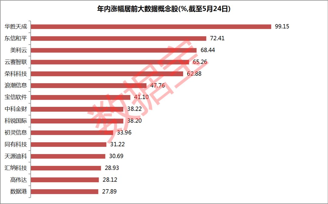 从个股来看,38只上下游涉及大数据概念的股票中,34股年内实现上涨,26股跑赢沪指,占比近七成。华胜天成股价几乎翻倍,涨幅高达99.15%,该公司主营系统集成、软件及自主产品等业务,在大数据领域,其2017年并购了美国GD公司,为客户提供全渠道第三方电子平台核心流程的开发和维护、云端应用以及大数据实时分析等服务;年内涨幅居第二、第三的东信和平和美利云分别上涨72.41%、68.44%。另外,云赛智联、荣科科技年内涨幅也超过60%。主营为“定制数据中心”等业务数据港年内股价也上涨了27.89%。