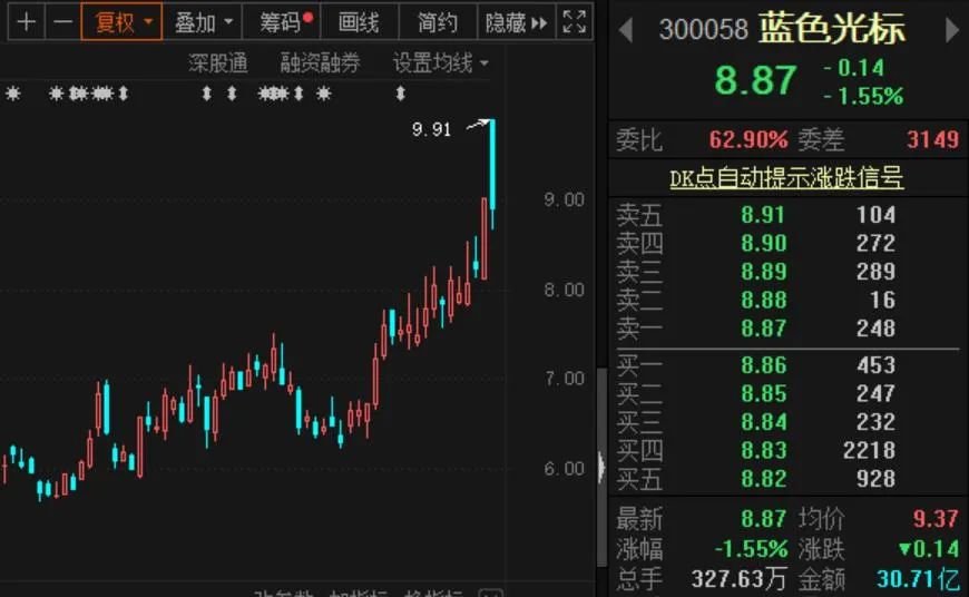 昨日网传字节跳动可能收购蓝色光标,致使蓝色光标在昨日涨停。不过,字节跳动今日表示,没有收购蓝色光标的计划,网传字节跳动收购蓝色光标的信息不实。蓝色光标股价开盘涨停,随后在公司进一步澄清后,股价大幅跳水。