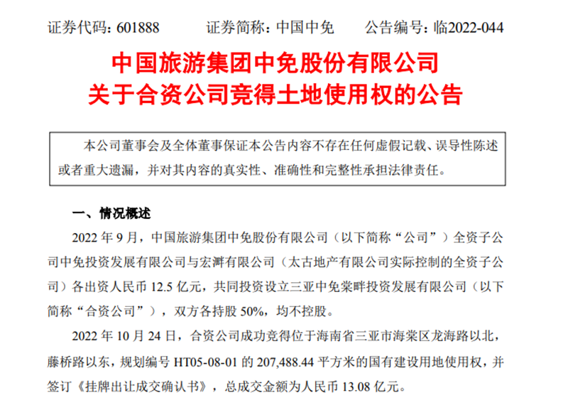 今年9月,中国中免全资子公司中免投资发展有限公司,与太古地产有限公司实际控制全资子公司宏溿有限公司各出资12.5亿元,共同投资设立三亚中免棠畔投资发展有限公司。