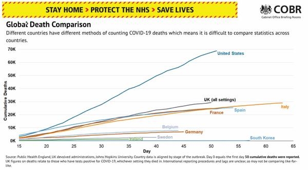 但是反对党领袖斯塔默挥舞着一张图表(上图)反击说,几周来政府一直在每日疫情发布会上用这样的疫情比较图表,现在说不能进行国际比较, “站不住脚”。