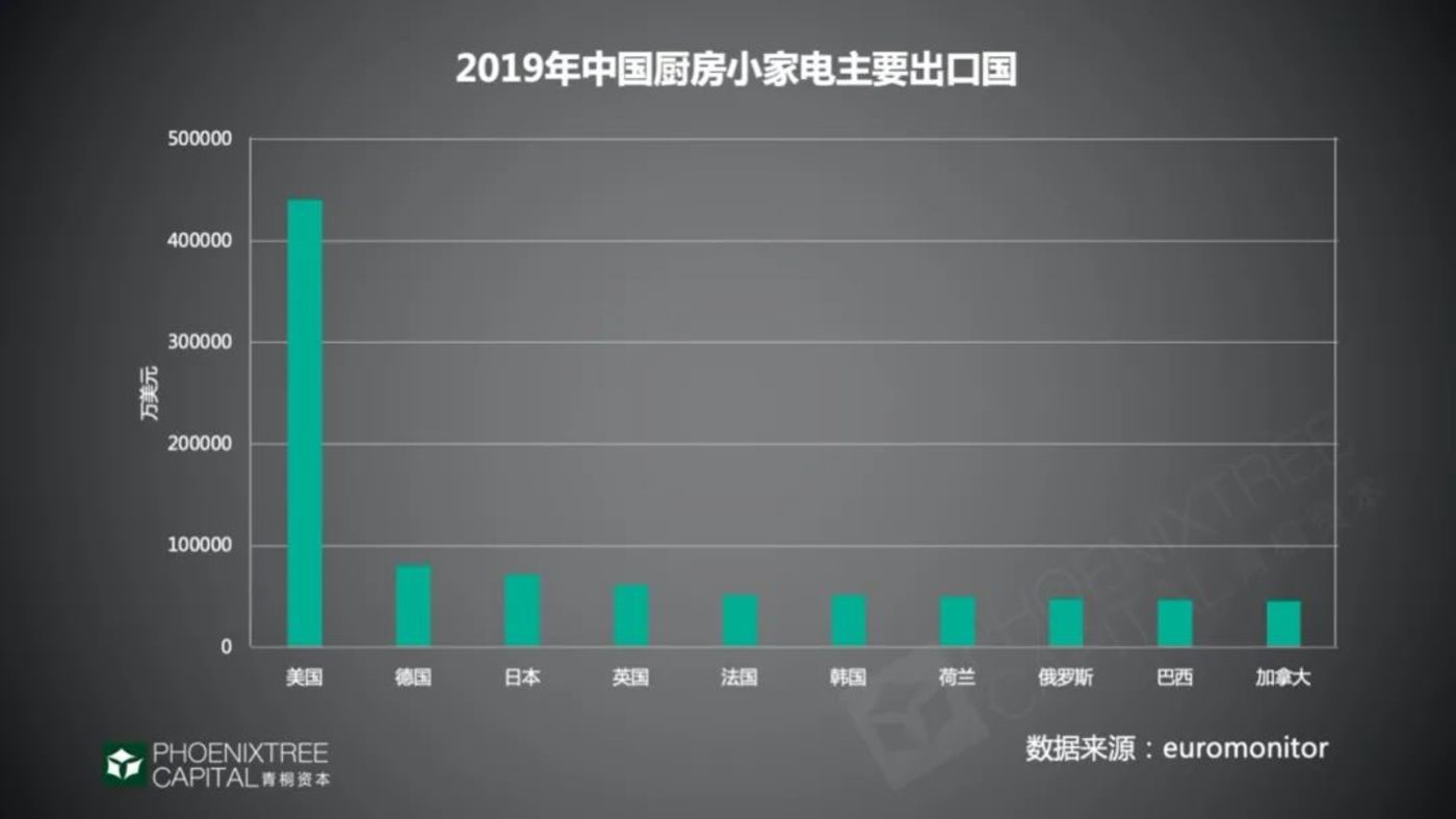 而欧美本身就是国产小家电的主要出口市场。根据中国机电产品进出口商会的数据显示,2019年中国厨房小家十大出口国中,美国以近45亿美元位列第一,并且欧美国家的份额占到80%。