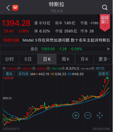 做空特斯拉的呼声未能阻挡特斯拉股价大幅上涨。截至7月9日收盘,特斯拉股价升至1394.28美元,今年来涨幅达233.30%。7月7日盘中,特斯拉股价一度升至1429.5美元,创历史新高。