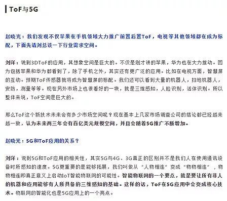 此外,知名电子行业分析师、现任天风证券研究所所长的赵晓光,不久前与炬佑智能创始人兼CEO刘洋共同探讨了ToF技术在5G生态下的应用与发展。