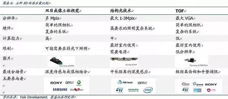 目前,实现3D Sensing共有三种技术,分别为双目立体成像、结构光和ToF。其中,结构光方案最为成熟,已经大规模应用于工业3D视觉。ToF则凭借自身优势成为在移动端较被看好的方案。