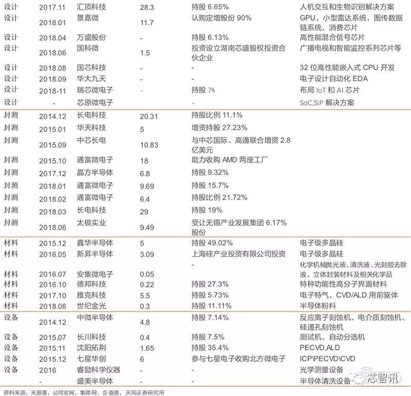 大基金一期已经投资不少上市公司,包括:设计领域(汇顶科技、兆易创新、景嘉微、国科微、中兴微电子、纳思达、北斗星通)、封测领域(长电科技、华天科技、通富微电)、设备材料(北方华创、长川科技、雅克科技)、化合物半导体与特色工艺(三安光电、耐威科技、士兰微、万盛股份)。
