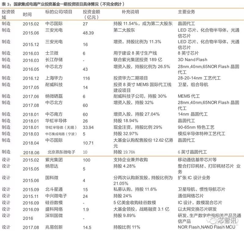在大基金一期投资项目中,芯片制造占67%、设计占17%、封测占10%,设备和材料投资仅占6%;并且主要投资行业龙头大公司。