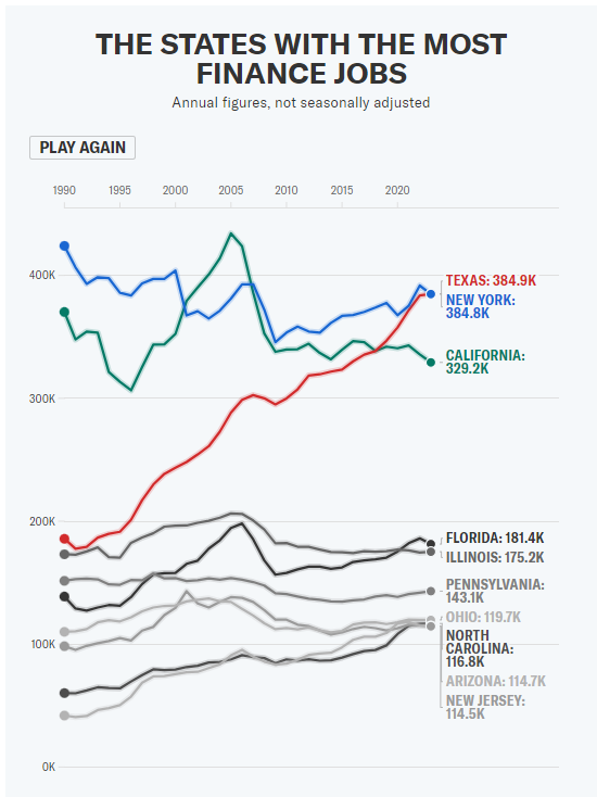 事实上,不仅仅是摩根大通,整个美国银行业都在上演类似的情景。根据媒体对美国劳工统计局1990年至2023年数据的分析,在金融业就业人数这个数据上,得克萨斯州33年来首次超过纽约州。