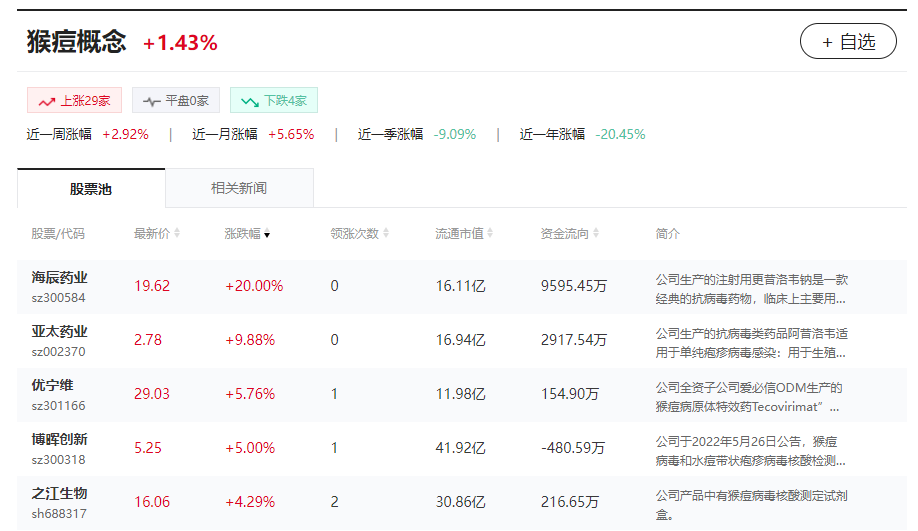 A股猴痘概念也整体走强,其中海辰药业20CM涨停,亚太药业收涨9.88%,优宁维、博晖创新涨超5%,之江生物涨4.29%。