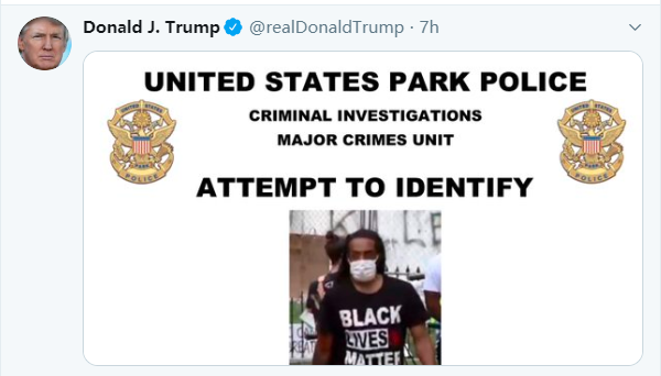 有外媒报道称,特朗普试图确认这些涉嫌破坏国家财产者身份的行为引发了一波批评。有网友表示,特朗普贴出的通缉令上主要都是黑色和棕色人种的抗议者。