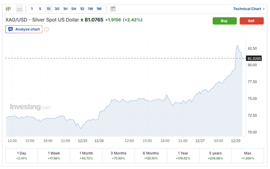 12月份,白银价格大幅飙升,这是贵金属市场整体火爆行情的一部分。周一亚市交易时段,现货白银一度涨超5%,站上83美元/盎司上方,继续刷新历史新高。截至目前,现货白银报81美元,日内上涨逾2%,为连续第六个交易日上涨。
