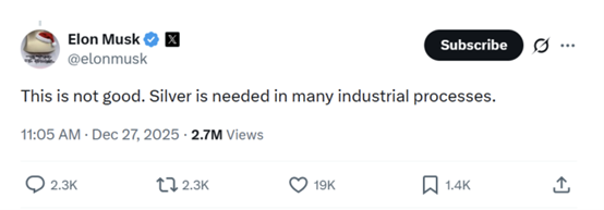 12月27日,马斯克在社交媒体上对银价不断上涨表达了担忧,直言这对工业发展“不是好事”。