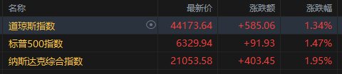 截至收盘,道琼斯指数涨1.34%,报44,173.64点;纳斯达克综合指数涨1.95%,报21,053.58点;标普500指数涨1.47%,报6,329.94点,为5月份以来的最大单日涨幅。