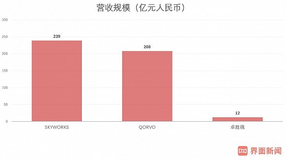 而从营收体量看,券商预测卓胜微2019年营收为12亿元,Skyworks上一财年营收为239亿元,Qorvo上一财年营收为208亿元。客观的说,卓胜微的体量和这两家公司根本不在一个量级。