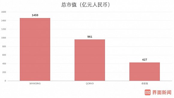 目前业务和卓胜微比较相像的上市公司有Skyworks和Qorvo两家公司,都在美股上市。卓胜微的市值不到Qorvo的一半,不到Skyworks的1/3。