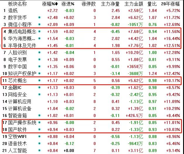 从盘面来看,今日早盘半导体及细分板块仍依旧强势,芯片股航锦科技涨停,科创板股芯源微、南大光电涨幅领先。最新收盘日涨幅前20的细分板块中,科技股占据半壁江山。半导体概念指数涨幅位居第六位,而细分的集成电路、华为海思芯片涨幅更加靠前。个股来看多只半导体概念股涨停,包括太极实业、华天科技、扬杰科技等。