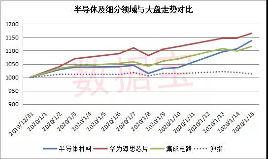 自2019年11月末阶段触底以来,半导体概念指数一路上涨,截至当前累计涨幅超过30%。2020年1月份以来半导体指数累计上涨4.8%,而集成电路、华为海思芯片指数涨幅超10%,均大幅跑赢大盘。