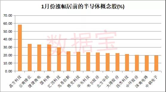 从1月份以来的市场表现来看,58只半导体概念股跑赢大盘股数量多达53只。晶方科技涨幅居首,高达58.46%,月度涨幅创历史新高,1月份以来仅2个交易日股价下跌,最新收盘价创历史新高。公司涉及芯片、集成电路概念,据悉新一轮长江存储设备开启采购,公司已CMOS影像传感器晶圆级封装技术起家。涨幅居次位的云南锗业1月份股价上涨34.2%,云南鑫耀半导体材料有限公司是云南锗业控股子公司,主要从事化合物半导体材料的研发和生产销售。捷捷微电、国科微、汇顶科技3股1月份以来股价涨幅均超过30%。