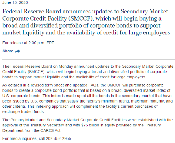 这将是美联储在本次危机中,首次在二级市场直接购入单个公司债券,此前美联储仅购入公司债ETF。美联储公告称,SMCCF将购买公司债券,以创建基于广泛、多元化的美国公司债券市场指数的公司债券投资组合。该指数由美国公司在二级市场发行的所有债券组成,这些债券满足该机构的最低评级、最高期限和其他标准。