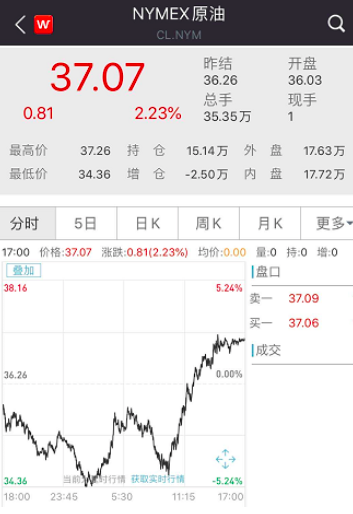 原油价格直线拉升。NYMEX原油期货由下跌超5个点转为上涨2.23%,收报37.07美元/桶,布油涨2.71%报39.78美元/桶。
