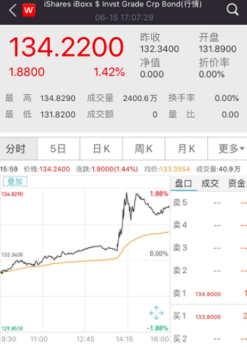 iShares iBoxx高收益企业债短线飙升,收涨0.97%,投资级公司债收涨1.42%,盘中点位创历史新高。