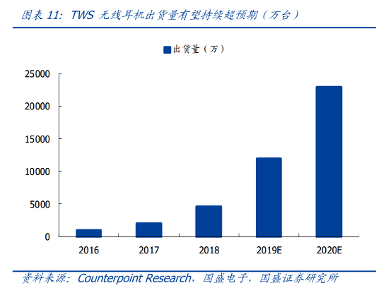 2019 年全球TWS耳机销量为1.2亿部,机构预计2020年TWS耳机的出货量将达到2.3亿部,同比接近翻倍。其中AirPods出货量有望达8200万台,同比增长34.43%。