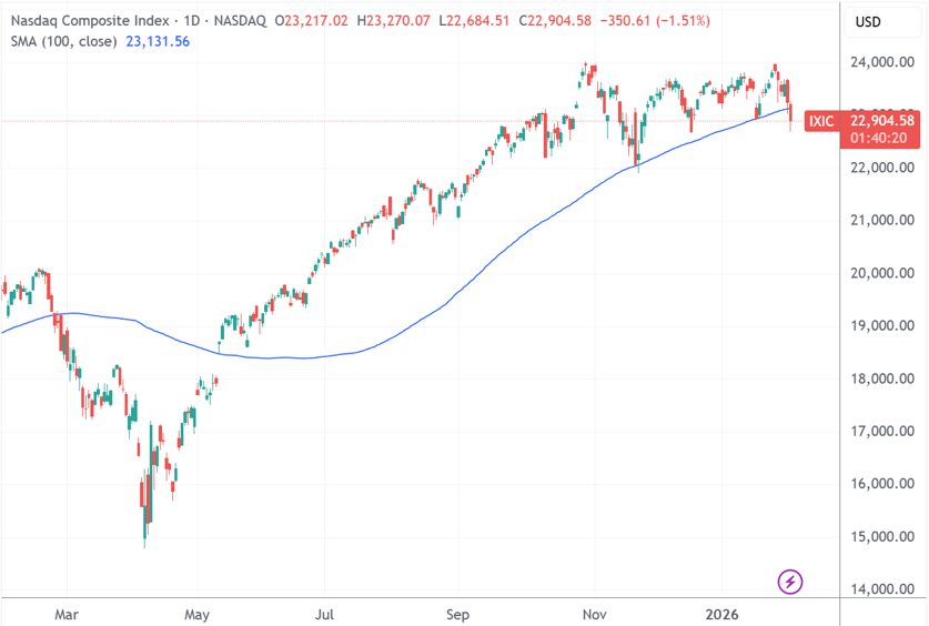 截至收盘,标准普尔500指数跌0.51%,报6882.72点;纳斯达克综合指数跌1.51%,报22904.58点;道琼斯工业平均指数涨0.53%,报49501.3点。连续两日下跌后,纳指也跌破了100日均线。