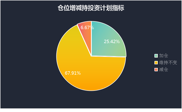 仓位增减更能体现私募对行情预判做出的应对,由于私募机构上月已经大幅加仓,本月计划增仓的私募数量减少,其中67.92%的基金经理选择维持现有仓位不变,25.42%的基金经理打算增仓或大幅增仓,剩余6.67%的基金经理欲降低仓位。