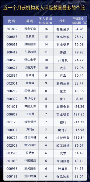 数据宝统计显示,近一个月共有36家A股公司获得不少于5家机构的扎堆推荐。紫金矿业、五粮液、豫园股份、芒果超媒、恒生电子和长安汽车获推荐的机构家数超过10家。