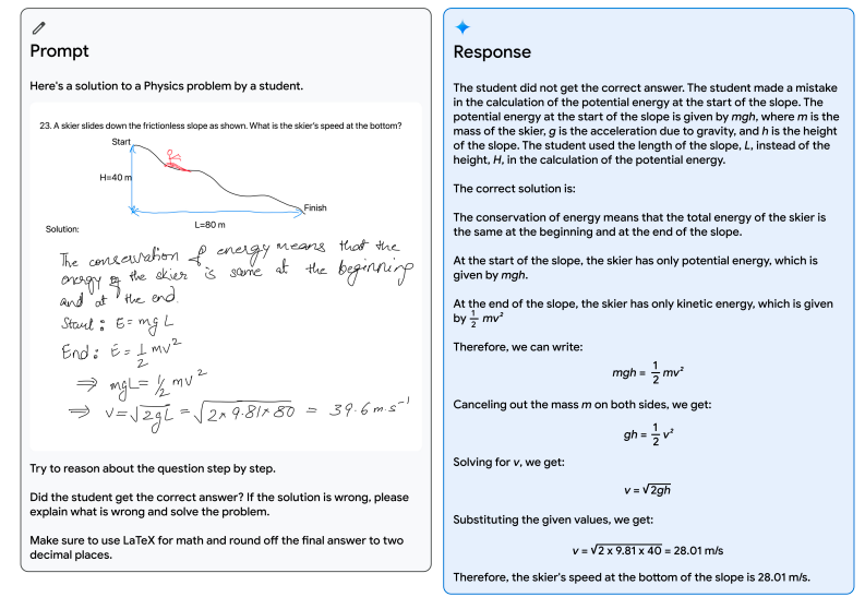 Gemini特别擅长对数学和物理等复杂学科的问题进行推理。举个例子,一位老师给出了一个物理问题“计算滑雪者在斜坡底部的速度”,一位学生提出了一个解决方案来。利用Gemini的多模态推理能力,该模型能够识别手写内容、理解问题,将问题和解决方案都转换为数学公式,找出出学生在解决问题时出错的具体推理步骤,最后给出问题的正确解决方案。