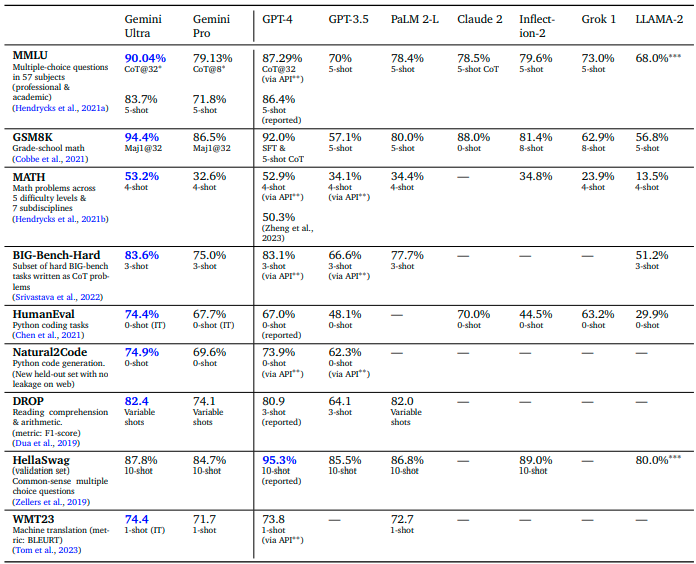 据谷歌介绍,从自然图像、音频、视频理解到数学推理,Gemini Ultra在32个常用的学术基准的30个上领先GPT 4。而在MMLU(大规模多任务语言理解)测试中,Gemini Ultra以90.0%的高分,成为第一个超过人类专家的模型。