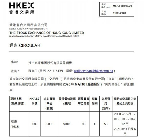 (1)京东(09618)期权合约,若相关股票成功上市,新股票期权将于 2020 年6月18日 (“开始交易日”)同日推出。京东股票期权的持仓限额为任何一个市场方向内所有月份未平仓合约合计均不得超越50000张。