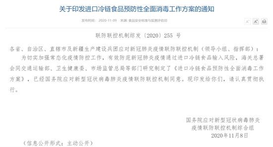 11月9日,国务院联防联控机制发布《进口冷链食品预防性全面消毒工作方案》,要求在进口冷链食品的各个环节,包括口岸查验、交通运输、掏箱入库、批发零售进行全面消毒,在进口冷链食品首次与我国境内人员接触之前就进行预防性的全面消毒处理。