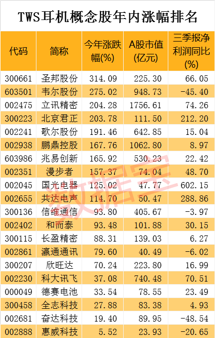 数据宝统计显示,TWS耳机概念股年内平均涨幅为123.41%,远远超出同期大盘指数。10只概念股年内涨幅翻倍,分别是圣邦股份、韦尔股份、立讯精密、北京君正、歌尔股份等,圣邦股份累计涨幅314%高居榜首。