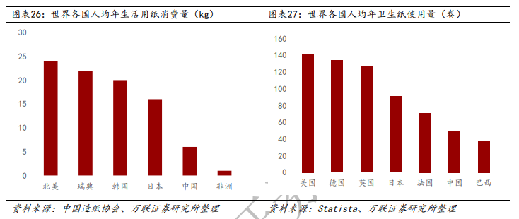 数据表明瑞典,美国等发达国家人均年生活用纸消费量在20kg以上,而同处东亚的日本、韩国人均年生活用纸消费量也在15kg以上,而目前我国的人均生活用纸消费量大约在6kg左右,所以至少还有三倍左右的发展空间。